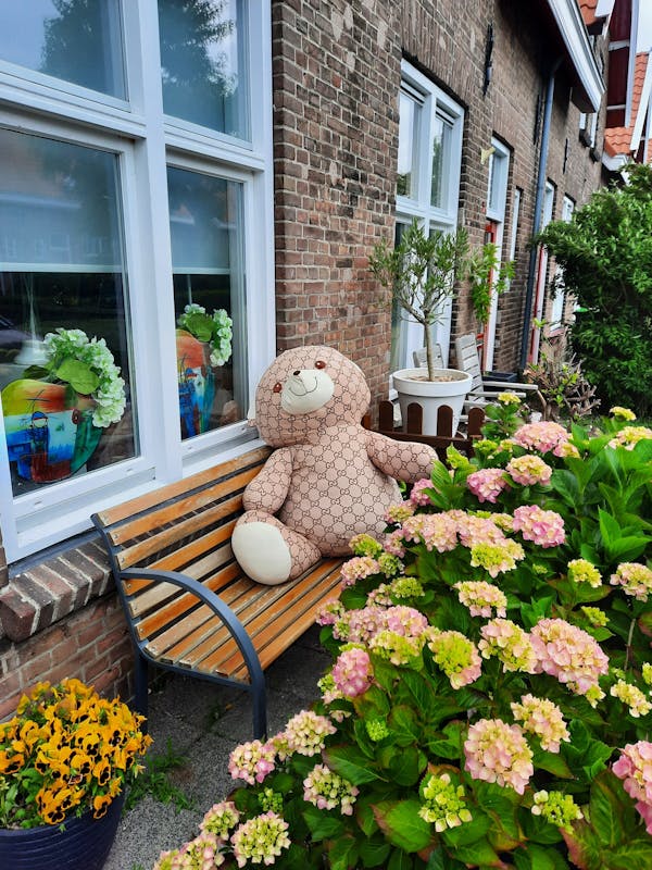 Is deze beer op het tuinbankje een aanmoediging voor ons werk en wellicht bedoeld als een mascotte? Als dit zo is wordt de beer uiteraard voorzien van een promo outfitje. Bij voorbaat dan hartelijke dank namens het team!